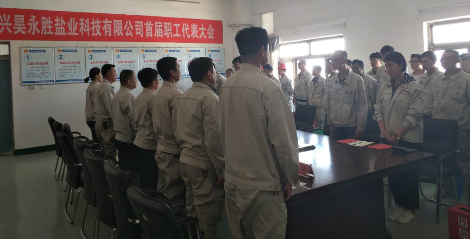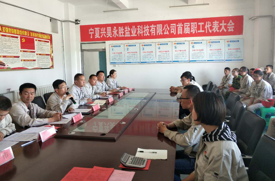 2018年5月30日,宁夏兴昊永胜盐业科技有限公司隆重召开工会成立暨第一次职工代表大会,出席本次会议的领导有宁夏金昱元广拓能源有限公司党总支书记马建东、宁夏金昱元化工集团公司工会副主席李新、宁夏兴昊永胜盐业科技有限公司副总经理尚继荣和党支部副书记王志杰、宁夏金昱元广拓能源有限公司工会委员刘志江和李佩祥、宁夏兴昊永胜盐业科技有限公司党支部委员张伟,45名职工代表列席参加会议。