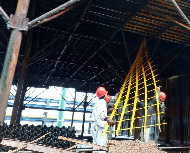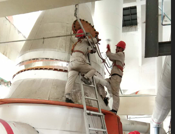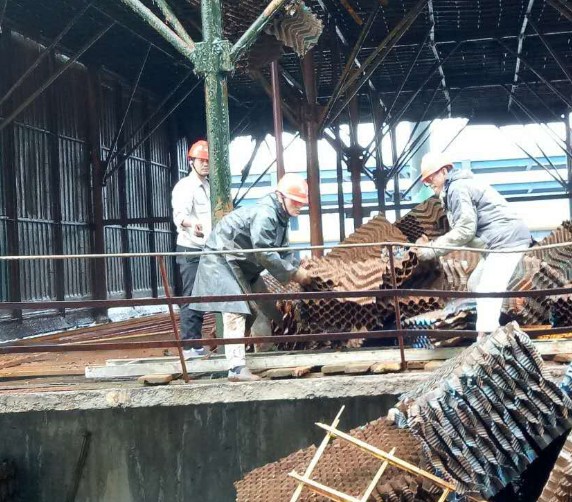 无论自身如何泥水相伴,冷却塔上下的检修人员你拆我接,你接我送,紧张有序、团结一致地进行着大面积的填料拆取、塔杆更换工作。