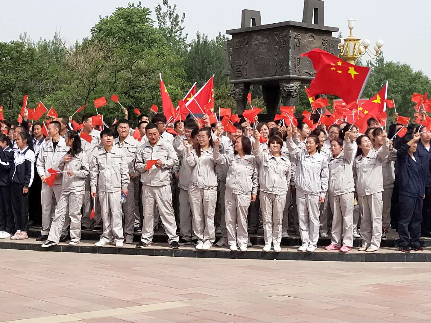 5月25日早上7时,宁夏金昱元集团青铜峡片区管理中心组织120人的合唱队,参加青铜峡市组织的“我为祖国点赞”快闪拍摄活动”,全体人员统一穿着“金昱元”新版全身工作服,精神饱满、激情唱响《我爱我的祖国》、《我爱你,中国》等歌曲,现场红旗飘飘,歌声嘹亮,路过的群众也不由自主,自发的加入到其中。。。