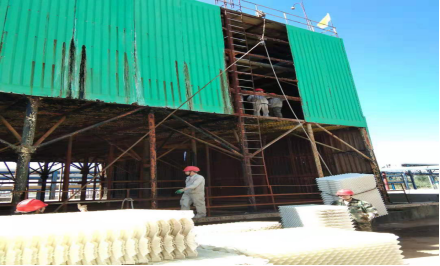 冷却塔填料更换已然不是之前直接性的你接我送,而是利用滑轮与绳索进行起吊,不仅大大的提高了工作效率,一眼望去也简单了许多,这是大家齐心协力,在实践中摸索出来的智慧与力量。