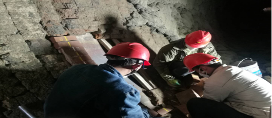窑砖紧固。加塞,在轰鸣的风镐声中,夹杂着交替起落的敲击声,工友们,正顶着满面的尘灰完成作业。