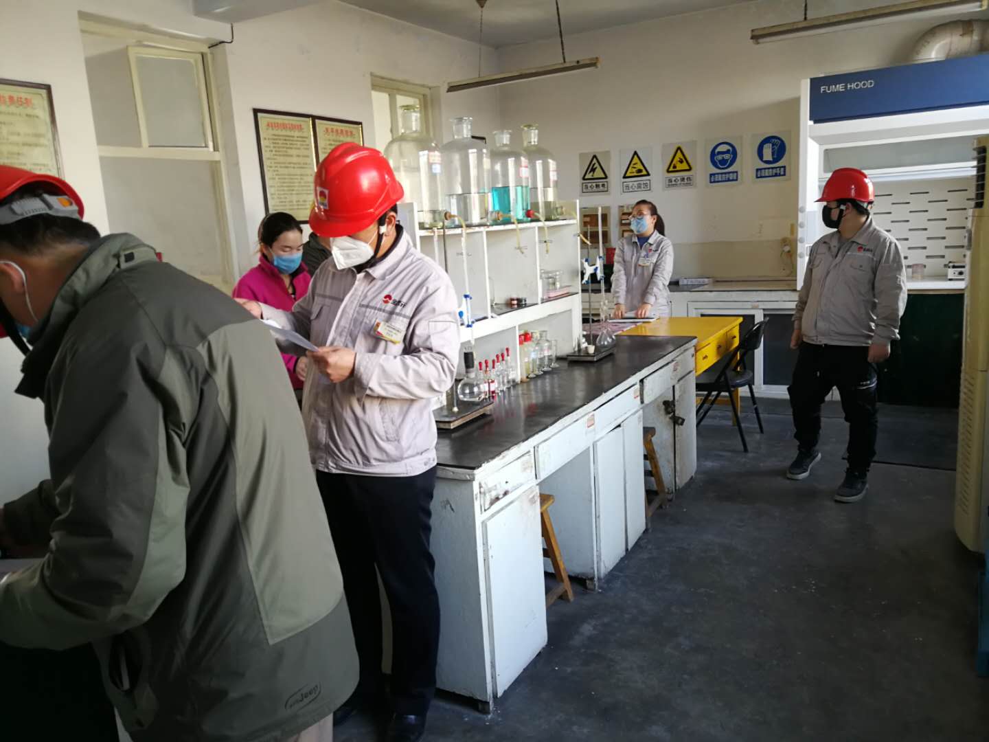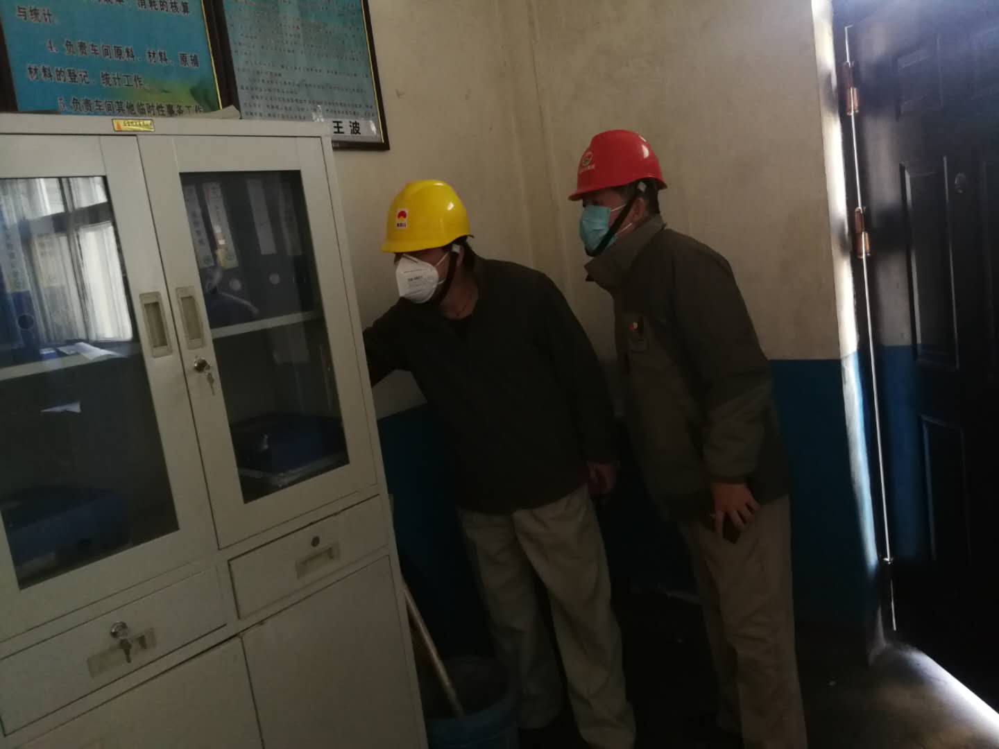 每到一个装置,检查人员都会详细的询问人员测温情况以及办公用品的消毒情况。王总强调:“一定要严格执行各项防疫规定,杜绝疫情蔓延途径,保障员工安全”。从南大门到原料装置,从电石炉到化验室,从成品装置到生料装置,检查人员的脚步踏遍了资源再生公司的每一个值班室和办公室,真正无死角的对疫情防控工作做了检查。