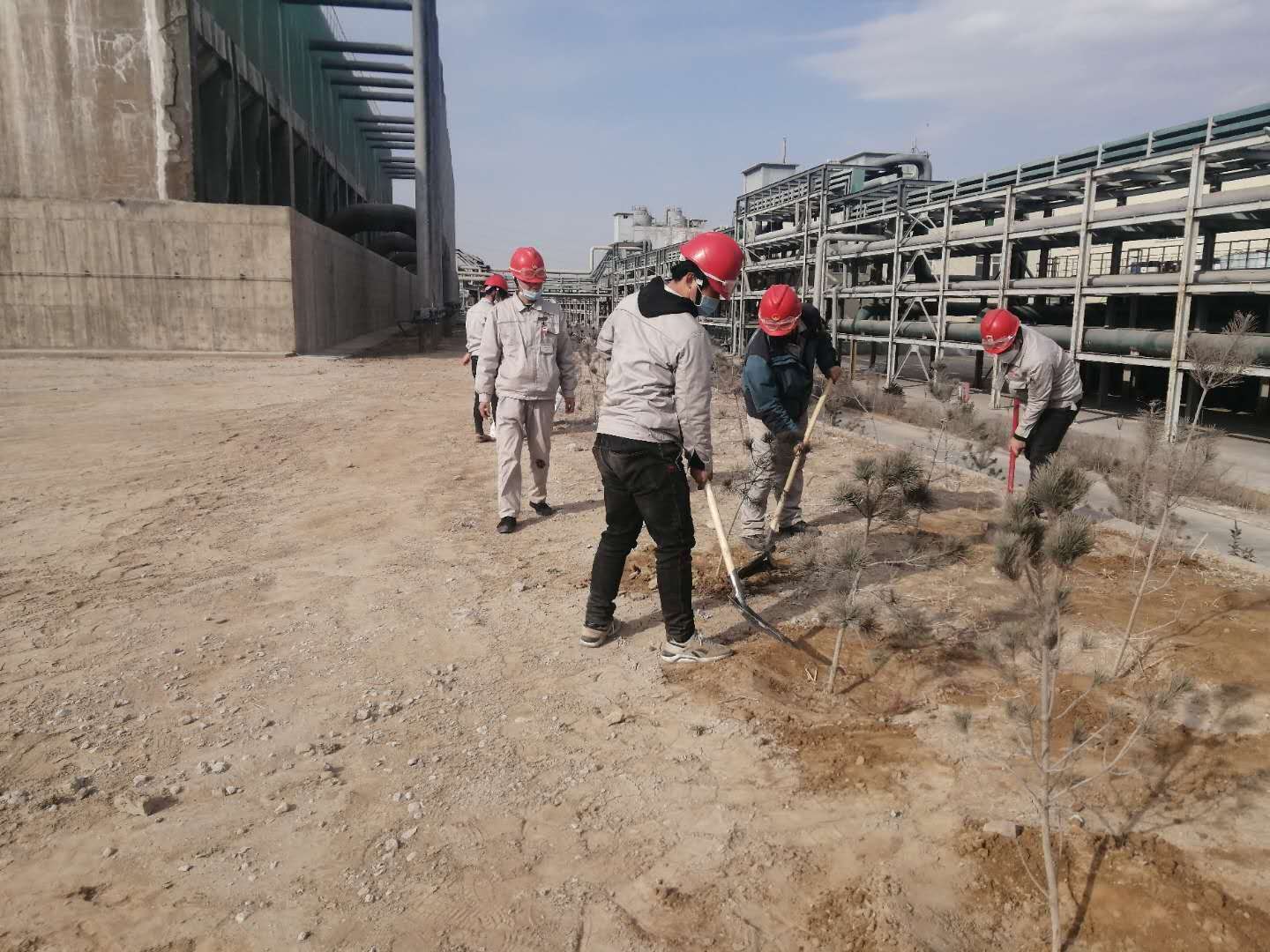 铲土、扶苗、踩实、浇水……随着一串串程序性动作一行行树苗迎风挺立。连日来我公司抓住春季植树造林的大好时机纷纷行动起来,各装置责任到人,分工明确,争相开展植树绿化活动。