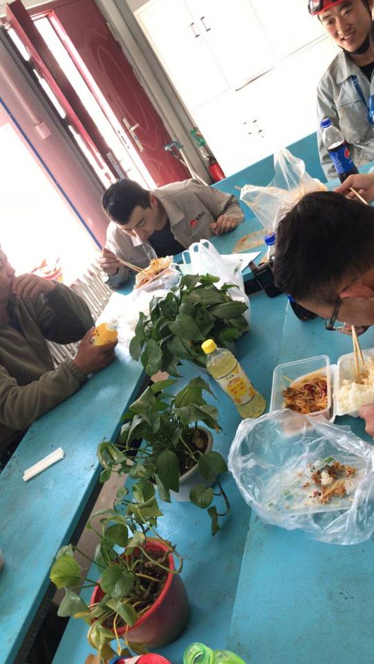 中午时分,辛苦的工作人员狼吞虎咽般的吃着热乎乎的饭菜