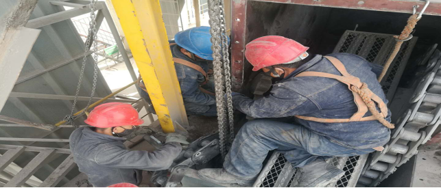 全心全意,争分夺秒。钳工电工配合默契,拉倒链、抬撬杠,大家齐心协力快速地1909提升机板链进行新旧置换。