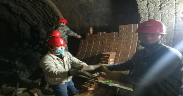 在回转窑挖补窑砖现场,他们手传手,开展接力,窑砖补填……