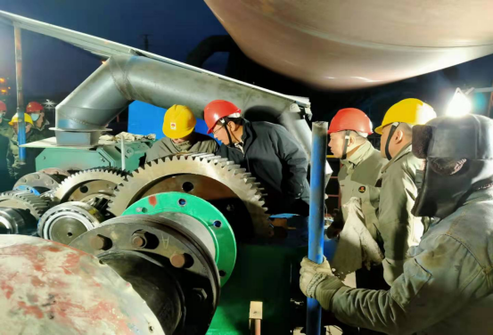 1月4日,塞北二九天气,室外温度已在零下16℃左右,傍晚夜幕降临,员工们在灯火通明的回转窑主减速机检修现场,迎着寒风刺骨,却是热火朝天,一派繁忙大干的景象。由于生产任务重,检修时间紧,公司领导班子带领员工克服种种困难,战胜诸多不利因素,不畏严寒,加班加点赶进度,争分夺秒抢工期,积极推进回转窑主减速机恢复正常运行。