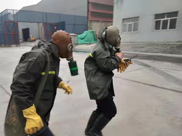 各组人员迅速展开抢险救援步骤。调度张培基抽调班组义务消防员携带应急物资(正压式空气呼吸器、酸碱手套、防毒面罩、警戒带、雨鞋、雨衣、应急药箱)至2#脱硫配浆池处集合……以氨罐区为中心点,将半径20米范围内人员进行疏散,根据风向标指示情况,将人员转移至上风口安全地带,对泄漏点南侧、北侧、西侧三面警戒隔离,防止无关人员进入;义务消防员佩戴正压式空气呼吸器,穿防护服至脱硫罐区打开喷淋装置,落实泄漏点具体位置,稀释有毒气体,并立即对泄漏点进行修复。经过15分钟的现场抢险救援,氨水泄露得到有效控制。