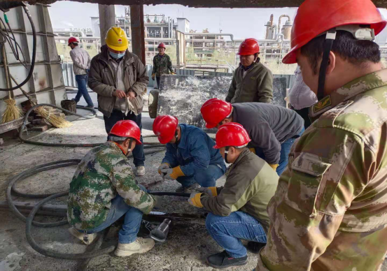 期间,此次检修的片区业务指导领导有总调度长徐建华、设备工程师刘迪文深入现场进行指导工作。公司参检人员为了抢时间,抢进度,副总经理梁军组织人员一方面实行车轮战,以最快的速度清理完窑内物料,另一方面组织装置专业技术人员钻入炽热的窑体内,进行窑砖回填。经过全体人员的连续不间断的奋战,比计划提前了3个小时。为确保抢修安全和质量,公司总经理、副总经理、安环生产科科长及成品装置长始终盯靠在现场,对抢修工作进行指导和协调。