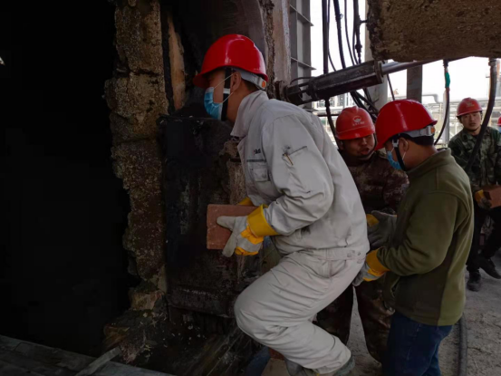 4月11日晚间22时50分许,回转窑筒体24.5米处出现红窑现象,根据经验,初步判断是窑砖脱落。回转窑系统止料,计划挖补。安环生产科科长张振忠得知消息后,立即向各级领导进行了逐级汇报,他们不约而同的在第一时间赶回厂里,立即采取相应措施,迅速组织抢修。12日凌晨1:40分许,全体管理人员及岗位巡检人员顶着寒风,组织实施第一步抢抢修工作——打开窑门,进行降温。上午8:00分,公司领导紧急召开抢修前技术和安全交底,调集人员,冒着窑内高温,进行边卸料边转运边挖补工作。按照分工,全体参战人员都在紧张有序的忙碌着。