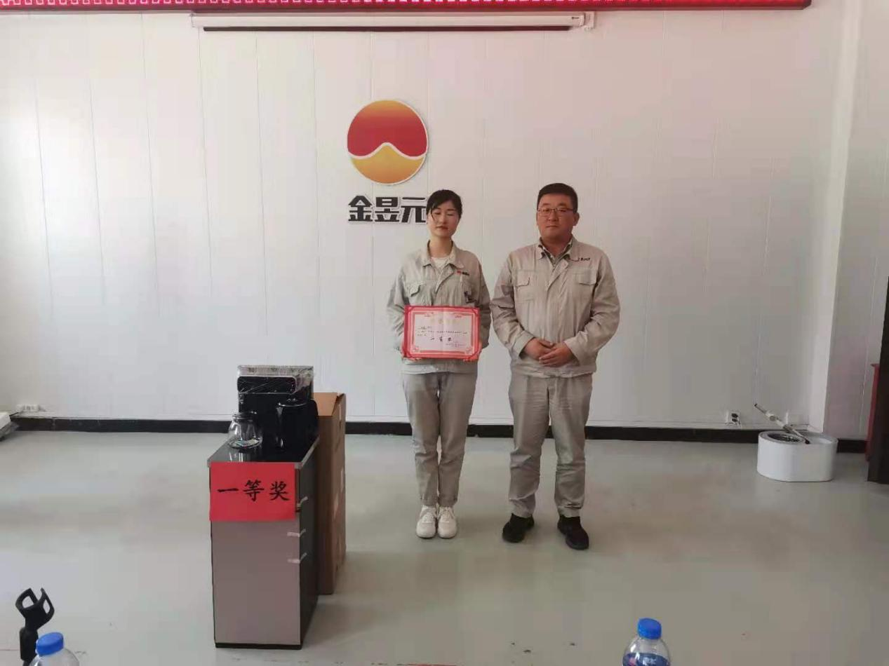 经过激烈角逐,最终本次比赛的一等奖由电解装置的海娟获得,奖品为茶吧机一台,化工公司总经理贾存富为她颁发了奖品和荣誉证书。