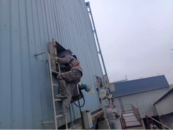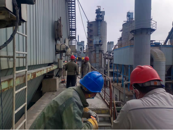 电收尘设备检修现场,由于电收尘内部极丝断裂和灰斗积灰严重,导致电收尘各电场无电压电流显示。11月4日19时30分,回转窑系统止料,计划停车24小时,检修窑尾电收尘器。除尘器检修都是内部操作,空间狭小,且都存在技术性,人员只能分头进行,轮流进行更换极丝和清除积灰,用扳手、3米左右长的卸料竹竿敲打极丝,一道道工序,都存在着一定的难度,一方面靠着臂力、靠着准心,另一方面就是人工完成拆卸更换极丝,清除灰斗积灰,靠的时耐心和责任。通过检査最终整修完成了更换11根极丝,清理了20个灰斗,圆满完成此项电收尘器检修任务。