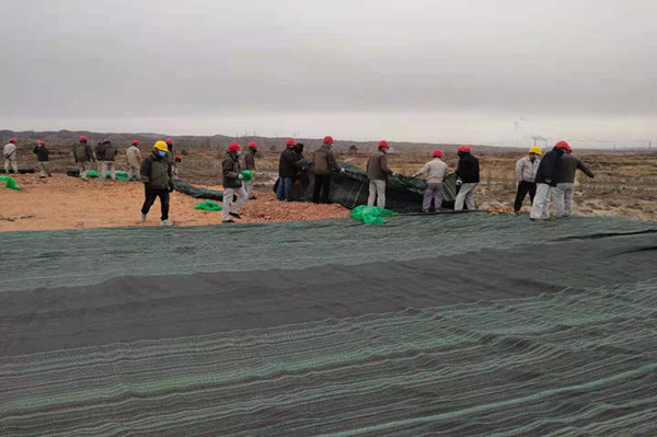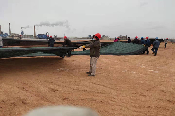 由于公司电石泥堆场地更换为新原料堆场造成的部分土地裸露,造成扬尘污染,治风沙、阻扬尘这项工作迫在眉睫;初冬的天气冷风呼啦啦扫动着满地的枯叶纸屑,浓黑的云像一团团破絮,倒悬在我们的上空,北风呼呼那个吹,任凭它的怎么肆虐却击退不了职工们工作的热情,瞧他们单膝盖在潮湿的泥土上细心的用铁丝链接着每个接口。男职工展现大力水手的魅力,两人一卷,一人一卷有序的摆放在裸露的土地中央,女同事也不甘示弱拆开整卷防尘网整齐的铺在砂石顶部,大家喊着整齐的口号,经过一早上不懈努力,就将整个原料场地覆盖完毕。既抑制满天风沙的场景,也保存了大量的原料被风带走,造成原料损耗。