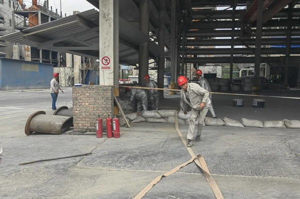 各应急救援小组到达现场,根据职责分工全力做好抢险准备工作。治安救护组按程序组织对现场设立警戒线,做好人员控制及疏散、道路疏通工作,生产保障组落实其他装置生产及现场防汛情况,同时组织进行灭火;抢险抢修组现场进行围堰堵水并疏通排水沟。抢险抢修结束后,对事故隐患再次进行排查、消除,并有序恢复现场生产作业。