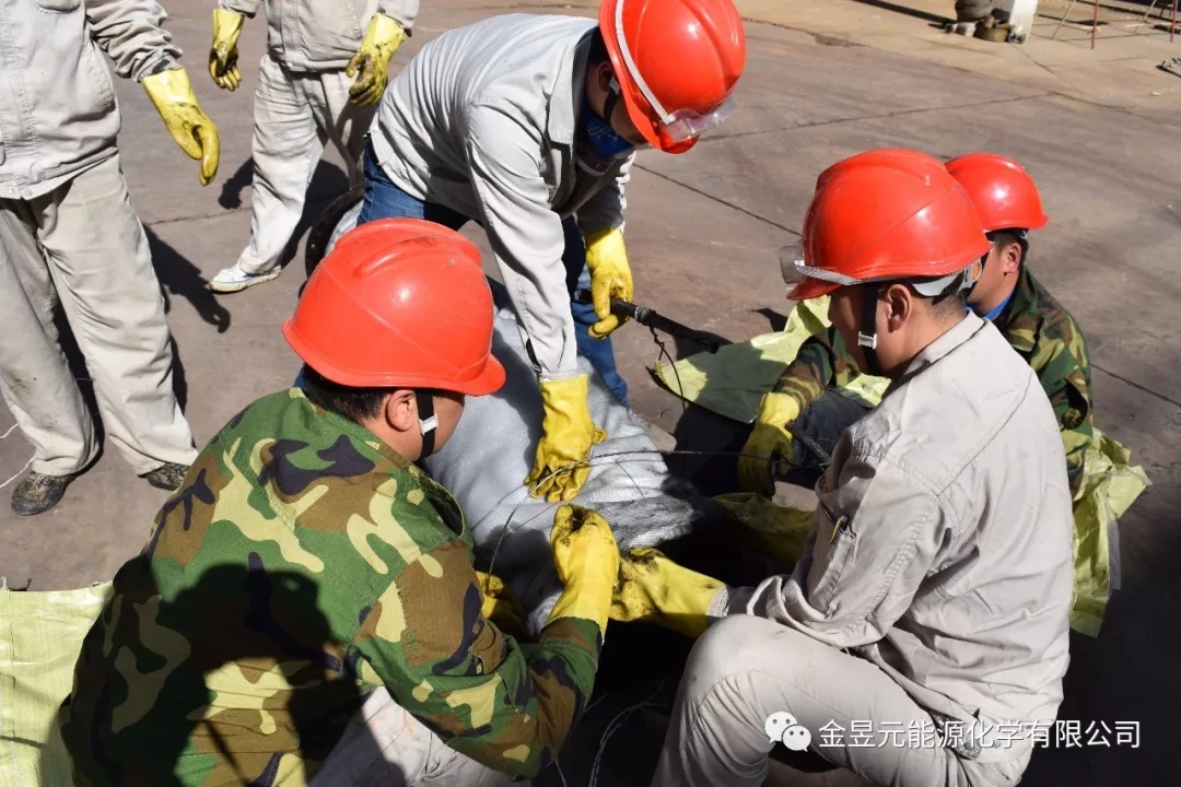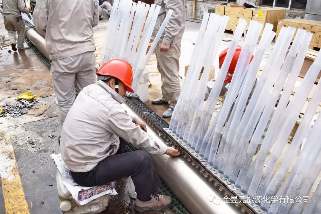 氯乙烯装置检修现场,检修人员正四、五人一组,齐心协力的给除雾器滤筒裹上厚厚的“棉衣”,为检修VI转化除雾器做好准备工作。