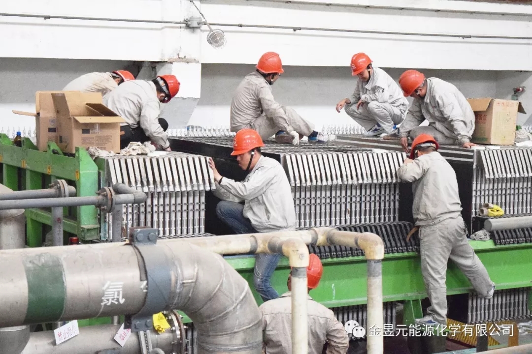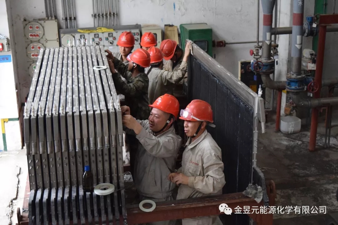 离子膜装置B槽检修作业现场,装置将去年A槽检修换膜总结的经验和方法充分运用到此次作业中,同时装置检修人员积极与厂家技术人员在铲胶、贴胶、贴膜等作业方法和技术上进行广泛的交流学习,有效加快了检修进度。