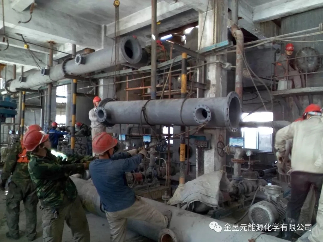 乙炔装置X清净厂房检修作业现场有条不紊,检修人员分工明确,各负其责,正在进行水环泵进出口管线更换的相关工作。