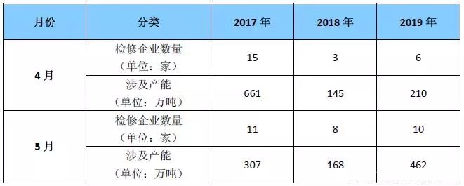 表1 2017-2019年4-5月烧碱检修厂家及涉及产能统计表