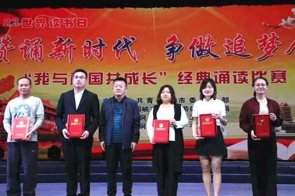 4月23日世界读书日,由中共青铜峡市宣传部、青铜峡市文化旅游体育广播局、青铜峡市总工会联合主办,青铜峡市图书馆承办的“赞颂新时代,争做追梦人——我与祖国共成长”经典诵读比赛在青铜峡市影剧院隆重举行。