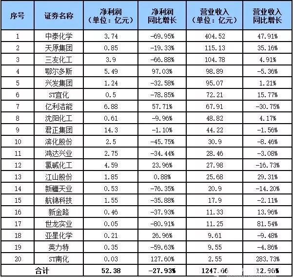 上市公司2019年度的半年报已披露完毕。广东塑料交易所统计了新疆天业、中泰化学、英力特、鸿达兴业等20家氯碱行业上市公司上半年的业绩情况,合计实现营收1247.66亿元,同比增长12.96%,净利润52.38亿元,同比下降27.93%;虽然利润出现下滑,但上半年这20家上市公司全部实现盈利。