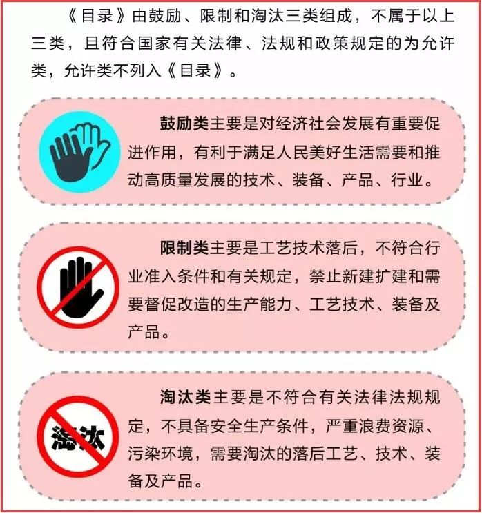目录(2019年本)共涉及行业48个,条目1477条,其中鼓励类821条、限制类215条、淘汰类441条。不属于以上三类,且符合国家有关法律、法规和政策规定的为允许类,不列入《目录》。