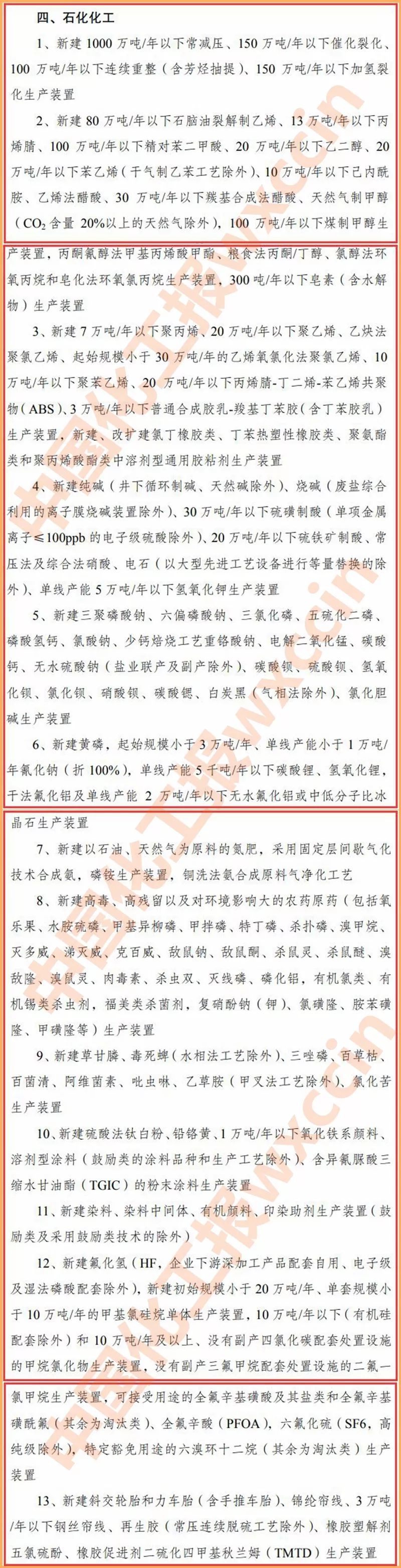 石化化工行业淘汰类有10大类,比征求意见稿少了2大类,包括:200 万吨/年及以下常减压装置,2.5 万吨/年及以下的单套粗(轻)苯精制装置,5 万吨/年及以下的单套煤焦油加工装置;单台产能 5000 吨/年以下黄磷生产装置;半水煤气氨水液相脱硫、天然气常压间歇转化工艺制合成氨、一氧化碳常压变化及全中温变换(高温变换)工艺、没有配套硫磺回收装置的湿法脱硫工艺,没有配套建设吹风气余热回收、造气炉渣综合利用装置的固定层间歇式煤气化装置,没有配套工艺冷凝液水解解析装置的尿素生产设施;钠法百草枯生产工艺,敌百虫碱法敌敌畏生产工艺,雷蒙机法生产农药粉剂,以六氯苯为原料生产五氯酚(钠)装置等。