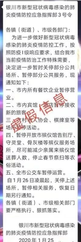 1月25日,秦某芳(女,70岁,银川市兴庆区居民)在一微信群内发布“银川市新型冠状病毒感染的肺炎疫情防控应急指挥部3号令”的虚假消息,造成不良影响,兴庆区公安分局已对秦某芳进行批评教育。
