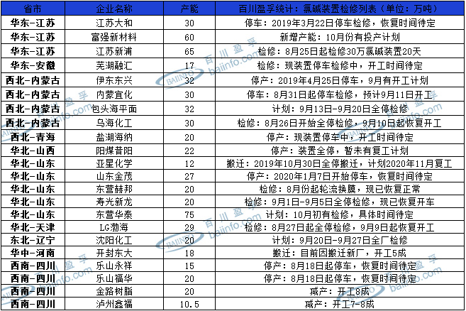 进入9月份我国氯碱装置开工情况较为平稳,氯碱检修企业较少,开工率维持在78%-81%之间。截止9月10日,中国氯碱装置具体检修情况如下图:
