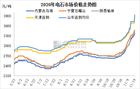 整体市场描述:上周五至今电石价格继续快速上涨,各地采购价连续上调300-400元/吨,电石出厂价上调200元/吨左右,且乌海及周边贸易出厂价推出了明日继续上涨100元/吨计划。至此,10月下旬至今,电石价格已连续上调了700-800元/吨,达到2011年9月以来的最高水平。本周电石价格仍在继续上调,主要仍因供需失衡,货源紧俏推动。内蒙古地区电石仍频繁有不同程度的限电现象,产量不足,宁夏石嘴山地区受重污染天气影响,本周后期有电石炉降负荷现象,外加其它复工电石炉恢复缓慢,电石增量较为有限;但PVC价格仍在连续上涨,前期停车PVC企业也有复产,整体开工高位,部分甚至超负荷运行,外加冬季来临前对电石也有补库需求,整体需求维持高位,综合导致电石货源持续紧张,价格得以连续上扬。