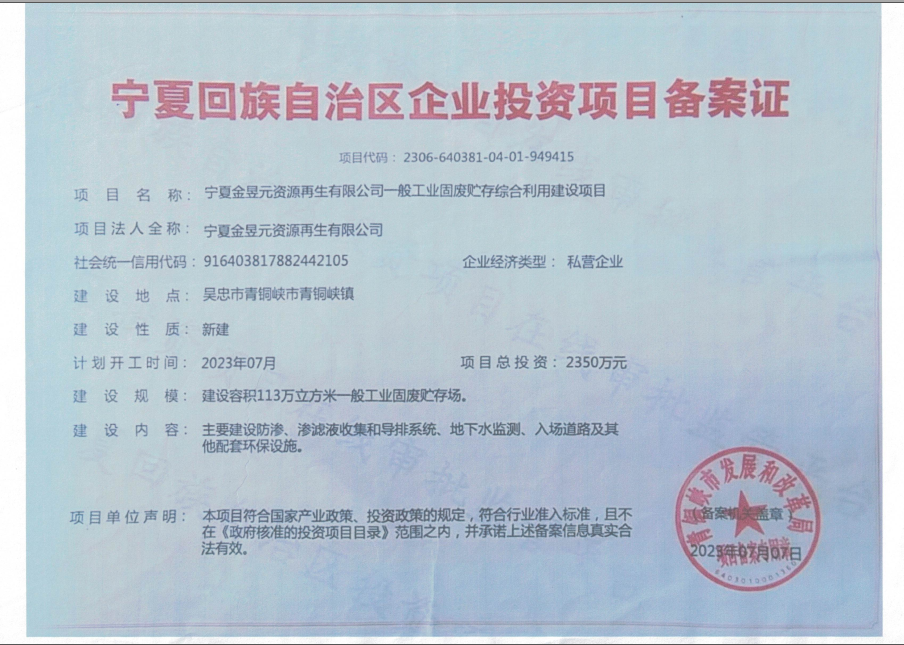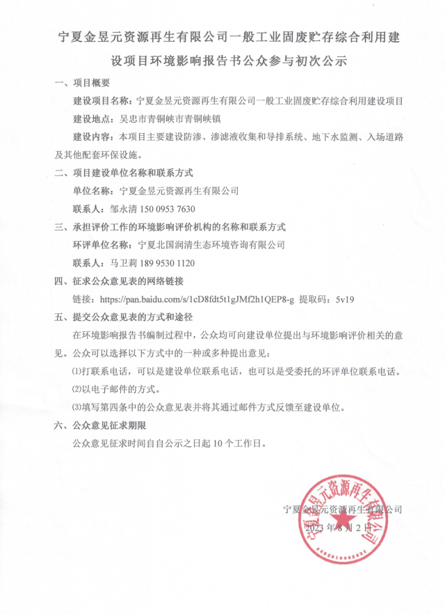 宁夏金昱元资源再生有限公司一般工业固废贮存综合利用建设项目环境影响报告书公众参与初次公示