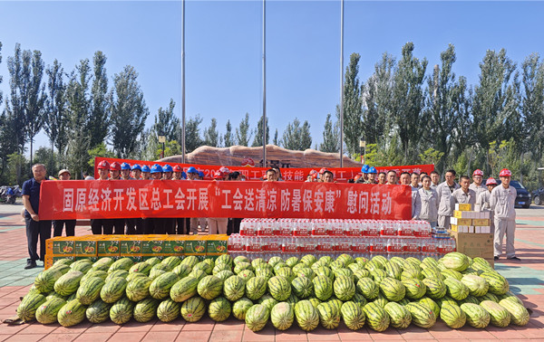 当青铜峡市委、政府和固原经济开发区总工会的领导为金昱元股份公司奋战在生产一线的员工们送上西瓜、饮料、茶叶、冰糖等防暑物品的时候,广大员工对上级政府部门领导的关心和厚爱深表感谢。炎炎夏日,上级政府部门送来的关爱使员工们如沐春风,深受感动。