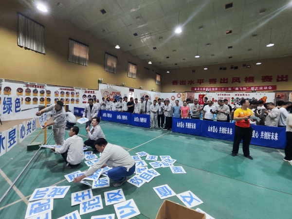 随着裁判一声令下,企业理念拼字比赛迎来激动人心的时刻。各参赛队员不急不躁、有条不紊,大家集思广益、默契配合,在最短时间内准确拼出“践行绿色发展 留驻青山绿水”“山水昱心 共创好未来”“安全就是幸福 安全就是效益”等横幅。